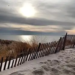 Watch Hill sits at the most southwestern point of Rhode Island on a stubby peninsula jutting into Block Island Sound.[6] It includes a smaller peninsula known as Napatree Point, a 1.5-mile (2.4 km)-long sandy spit that extends west from the Watch Hill business district, and Sandy Point, which was once attached to Napatree Point. Both Napatree and Sandy Point shelter Little Narragansett Bay and have made Watch Hill a popular harbor around which the business district has grown.