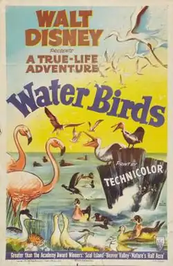Water Birds is a 1952 American short documentary film directed by Ben Sharpsteen. In 1953, it won an Oscar for Best Short Subject (Two-Reel) at the 25th Academy Awards.[1] The film was produced by Walt Disney as part of the True-Life Adventures series of nature documentaries.[2] It was shot in Technicolor by more than a dozen cameramen and was created in cooperation with the National Audubon Society and the Denver Museum of Natural History.[3]