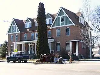 In the summer visitors included tourists, salesmen, telephone linemen, state and county road crews, railroad executives, and officers of the Hypotheek Bank. The Dutch bank held many of the area farm mortgages. Single schoolteachers were often permanent guests. A chiropractor used his bedroom as an office and the Binyon Optical Company used the hotel as an operating base several times a month. The construction of Interstate 90 and changes in automobiles, and motel competition led to the decline in demand. It was finally closed in 1977.[2] The Waterville Hotel is two and one-half story brick building in the Jacobethan Revival Style. Jacobethan includes the dormers, half timbering, arched windows, and a porch. The hotel is at the center of the town's original plat. The main street (Chelan Street) is two blocks east. [2] The foundation is elevated using basalt boulders, from Douglas Creek, five miles to the east. The hotel is built with red bricks from A.C. Rogers kilns, one mile south of town. Rogers' kiln bricks were used for many of the Waterville buildings. These bricks are porous and weaker that other sources.