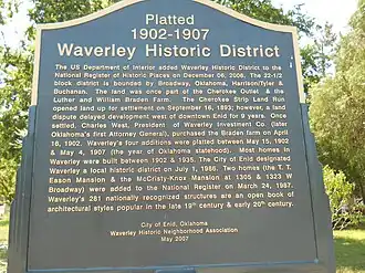The Waverley Historic District is located in Enid, Oklahoma, and has been listed on the National Register of Historic Places (NRHP) since 2006.[1] It consists of four Waverley additions. The William and Luther Braden farm was the first parcel of land to be platted by the Waverley Development Company in May 1902. Subsequent additions were platted in 1905, 1906, and 1907. The District has 275 buildings built between 1895 and 1935. Architectural styles in the district include Queen Anne cottages, Folk Victorian houses, Colonial Revival houses, Craftsman Bungalow and Prairie School Foursquare Houses. There are also a few Tudor Revival, Neoclassical, Italian Renaissance, and Spanish Eclectic homes.[1]