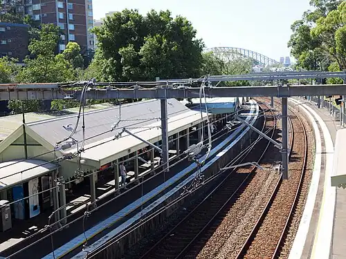 With the opening of the Sydney Harbour Bridge in 1932 and construction of new stations at North Sydney and Milsons Point on a much higher level (to suit the bridge arrangements), the trackwork at Waverton was substantially altered. The original line which was laid down the grade, through the Lavender Bay tunnel to the original Milsons Point station at Lavender Bay became a branch line. The original terminus sidings at Milsons Point was then re-used as off peak storage sidings for the suburban electric cars, and is still in use today. To suit this new arrangement and allow electric car sets to either re-enter service after storage at the sidings, or for car sets to proceed to the sidings, a new dead-end siding was laid in behind the existing Down main platform at Waverton, but at a slightly higher level. Trains from the storage sidings would proceed into the dead-end, reverse and proceed through points toward North Sydney, whereas trains coming out of service would enter the dead-end siding from North Sydney, reverse and proceed down to Lavender Bay. This arrangement is still in use today.[3]