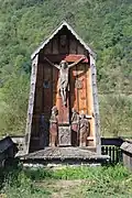 Often, the crosses are surrounded by a shelter, with a door towards the road and windows at the sides. Travelers hit by rainstorms can wait inside. In the past, where the water source was farther away, villagers would leave a pitcher of fresh water for passersby. Shelters are rarer in hay and mountain areas; the crosses there are usually covered by tile roofs.[4] The shelters, which form a sort of chapel, are usually painted on the exterior and interior. Christ Pantocrator or the Trinity is on the ceiling, flanked by the Four Evangelists, angels or prophets. Saints and angels are found lower down, with empty spaces filled by grape leaves, ears of wheat, floral or geometric patterns. The exterior might feature medallions of saints or Biblical scenes. Inscriptions appear painted on the inside or carved into the cross.[5]