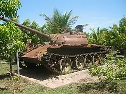 A wide variety of weapons was used by all sides in the Cambodian Civil War. American military aid was funnelled to the FANK through the Military Equipment Delivery Team, Cambodia (MEDTC) program. Authorized a total of 113 officers and men, the team arrived in Phnom Penh in 1971,[2] under the overall command of CINCPAC Admiral John S. McCain Jr.[3] In the early months of the War, most Cambodian Army infantry, armoured and artillery units fought the PAVN and Khmer Rouge with a mix of surplus World War II-vintage French and U.S. and modern Soviet and Chinese small-arms, armoured vehicles and artillery pieces either inherited from Khmer Royal Army stocks or delivered as emergency aid by the Americans.[4][5] ANK infantry battalions later sent to South Vietnam for retraining between February 1971 and November 1972 under the US Army-Vietnam Individual Training Program (UITG) were re-equipped upon their return to Cambodia with modern U.S. small-arms, comprising revolvers, automatic pistols, assault rifles, light machine guns, medium and heavy machine guns, grenade launchers, anti-tank rocket launchers, mortars and recoilless rifles.[6] Besides infantry weapons, the U.S. MEDTC also provided the FANK branches with more modern U.S. military equipments, which included aircraft, armoured and transport vehicles and long-range artillery pieces, plus naval and riverine vessels.[7][8][9] Although the UITG and MEDTC aid programs allowed the FANK to standardise on modern U.S. weapons and equipment, they never superseded entirely the earlier weaponry, particularly in the case of the territorial units and rear-echelon support formations. In addition to U.S. support, the FANK received further military assistance from South Vietnam, the Kingdom of Laos,[10] Thailand, Indonesia,[11] the Philippines,[12] Singapore,[13] the Republic of China (Taiwan), Australia and New Zealand.[14]