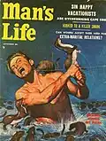Frank Zappa recruited artist Neon Park to create a subversive image based on a cover story from the September 1956 issue of Man's Life, a men's adventure magazine. The magazine's cover story depicts a shirtless man being attacked by numerous weasels, above the caption "Weasels Ripped My Flesh". After showing Neon a copy of the magazine, Zappa inquired, "This is it. What can you do that's worse than this?" Neon's answer was to craft a parody of an advertisement for Schick brand electric razor based on the "Weasels Ripped My Flesh" theme.[4] The record company released the album despite its reservations about the album cover.[5][6]