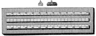 To facilitate the temperature calculation, Wedgwood built a device which would directly read the temperature. Two metal bars with scales on them were fixed one above another on a metal plate and inclined at a small angle. The spacing between the bars was 0.5 inches at one end and 0.3 inches at the lower end. The scale was divided into 240 equidistant parts. The unheated piece of clay would fit the 0.5-inch gap giving the zero temperature reading. After annealing, the clay cylinder would shrink and fit somewhere in between the left and right ends of the bars, and the temperature could be read from the scales on the bars.[9][10]