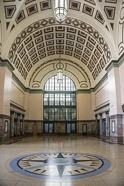 The main entrance is on the south side via a colonnade of eight 13-metre- [42-foot]-high Doric columns opening into a large booking hall decorated with delicately mottled dados extending to a high vaulted ceiling.