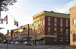 The Pink House is an Italianate-Revival mansion located on the corner of West State Street and South Brooklyn Avenue. Constructed between 1866 and 1869, it was designed by Edwin Bradford Hall, a local pharmacist and businessman who also created its signature pink paint at his Wellsville drugstore, now the site of the Beef Haus restaurant.[16][17][18] According to family legend, the pink color and design of the house were inspired by a villa E.B. Hall and his wife Antoinette saw while honeymooning at Lake Como in Italy.[16]