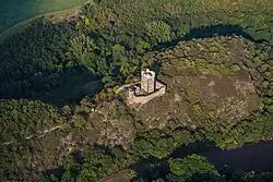 The ruins of the hill castle are situated above the River Nette at the foot of the Eifel mountains in the immediate vicinity of the Plaidt junction on the A 61 motorway. In the eastern part of the hill spur, on the narrowest part of which the castle was built, there was a Roman fortification in the Late Antiquity. The origin of this defensive position, which was probably conceived as a refuge fort, has been dated by coin finds to the first half of the 4th century. On the basis of pottery finds, it is assumed that the fort was used until the early 5th century.[1]: 53 Similar sites from the Late Antiquity along the Nette are found at Welling, Ruitsch and on the Katzenberg near Mayen.