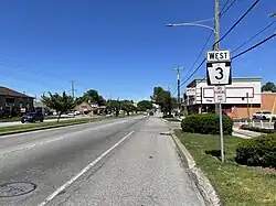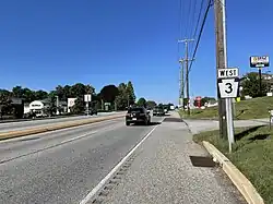 PA 3 begins at an intersection with US 322 Bus. (High Street) in the downtown area of the borough of West Chester in Chester County near the historic Chester County Courthouse. From here, the route heads northeast on the one-way pair of East Market Street eastbound and East Chestnut Street westbound. The one-way streets carry two lanes in each direction as they pass downtown businesses. At the intersection with Matlack Street, the westbound direction of PA 3 shifts from East Chestnut Street to East Gay Street. The route continues to follow East Market Street eastbound and East Gay Street westbound through commercial areas, passing north of the terminus of the West Chester Railroad at the West Chester station along East Market Street. PA 3 leaves West Chester for West Goshen Township and intersects Montgomery Avenue (westbound only) and Garfield Avenue/Westtown Road before it comes to an eastbound exit and westbound entrance with Paoli Pike. At this point, both directions of the route join and head east along four-lane divided West Chester Pike, passing through residential areas in the community of Chatwood. PA 3 comes to a partial cloverleaf interchange with the US 202/US 322 freeway and runs past businesses and some homes. The road curves east-southeast at the Strasburg Road intersection and crosses into East Goshen Township, where it continues past suburban neighborhoods and commercial establishments, crossing the East Branch Chester Creek and passing through the community of Goshen. PA 3 enters Westtown Township and reaches an intersection with PA 352, forming a short concurrency with that route before PA 352 splits to the southeast. The road heads east through wooded areas with residential subdivisions as it continues into Willistown Township. The route intersects the eastern terminus of PA 926 and curves east-northeast through a mix of fields and woodland with some homes, crossing the Ridley Creek before coming to a junction with Delchester Road.[3][4]