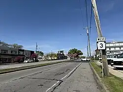 In 1954, regular trolley service between Philadelphia and West Chester ended as plans were made to widen PA 3. Trolley service during peak periods continued until 1958.[6] The trolley service was replaced by buses, which is today part of SEPTA's Route 104 service.[6][16] During the mid 1950s and early 1960s, the West Chester Pike portion of PA 3 was widened into a four-lane road.[6] US 202 and PA 3 were routed onto a one-way pair in West Chester along Market and Gay streets by 1959.[17] By 1960, PA 3 was rerouted to follow Cobbs Creek Parkway and Baltimore Avenue to end at US 13 at the intersection of Baltimore and Whitby avenues in Southwest Philadelphia.[18] The route was realigned to follow Chestnut and Walnut streets to US 13 at 44th and 43rd streets by 1970.[19] Also by this time, the US 202 concurrency in West Chester was removed as that highway was rerouted to bypass the borough to the east along US 322.[20] PA 3 was extended east to PA 291 and PA 611 at Philadelphia City Hall during the 1970s. The route followed Chestnut and Walnut streets to US 13 at 38th Street before running along Chestnut Street eastbound and Market Street westbound to 30th Street Station, where it shifted to Market Street eastbound and John F. Kennedy Boulevard westbound.[21]