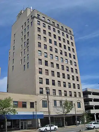In the 1880s, the west side district overtook the east side as the principal commercial center of the city. John R. Porter established a successful pharmacy that stayed in business for over a hundred years. The D. J. Stewart & Company building on South Main Street hosted the Rockford Department Store until it moved into a new Romanesque Revival building in 1893. The Panic of 1893 halted downtown development for another decade. The Soldiers and Sailors Memorial Hall was dedicated by President Theodore Roosevelt on July 3, 1903. Daniel Burnham designed the 1905 Rockford Trust Building in the Chicago School motif.[2]