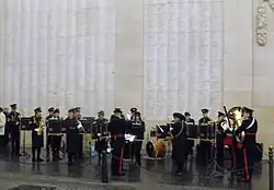The regimental war memorials to the Essex Yeomen who died in the two world wars are in St Peter's Chapel in Chelmsford Cathedral,[69][71][72] together with individual memorials to L/Cpl Harold Mugford, VC, (unveiled in June 2006)[54][69] to Brig-Gen Sir Richard Colvin[73] and to Col Sir Francis Whitmore.[74] There is also a memorial window to Sir Richard Colvin in the Lady Chapel of Waltham Abbey Church. A memorial to the men of 3 Troop, D Sqn, Essex Yeomanry, and other local Territorials who died in World War I was at the Army Reserve Centre at Romford.[75] In May 2009 a memorial was dedicated in Saint George's Memorial Church, Ypres, to commemorate Essex Yeomen who died in the Ypres Salient,[69] most of whom have no known grave and are listed on the Menin Gate Memorial to the Missing.[45] The regimental memorial in Normandy is at Asnelles on Gold Beach.[69]