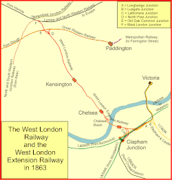 The line was on the alignment of the defunct Kensington Canal, crossing the Thames by New Battersea Bridge (known locally as Cremorne Bridge). In these days long before street tramcars and tube railways—the world's first Underground railway, the Metropolitan Railway opened earlier in 1863—the provision of through trains to all possible destinations seemed to be desirable, even if the frequency was very low.