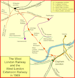 - LNWR, three trains a day from Harrow to Kensington; and trains from Camden LNWR station to Kensington, reversing at West London Junction (there was no station at Willesden at this period);