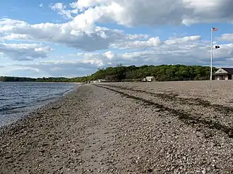 ![]() The shoreline of the West Meadow Beach Historic District, with a few cottages | |
