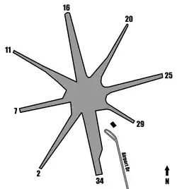 The airport was located about 4 miles (6.4 km) west of Downtown Albuquerque, on the north side of Central Avenue at what is now Airport Drive. The airport had four unpaved runways arranged in the shape of an eight-pointed star, the longest of which was the 6,300-foot (1,900 m) runway 16/34. The main buildings were the 125-by-150-foot (38 by 46 m) hangar, which was designed to house two Fokker F-32 aircraft,[3] and the Pueblo-style passenger terminal. When built, the location on the West Mesa was surrounded by empty desert, though it has mostly been filled in with new development since the airport closed.[6]