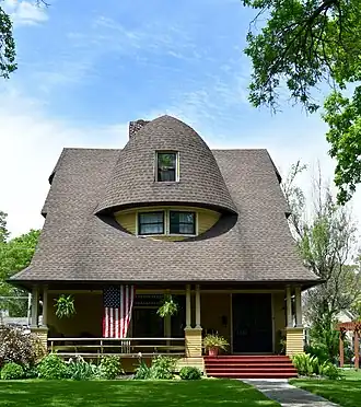 For the most part the buildings in the West Ninth Streetcar line Historic District are houses and their ancillary buildings, namely garages and stables. There are a total of 145 buildings. Of these 97 buildings are contributing properties.[2] Most of the buildings are single-family houses. Nine of the buildings are multi-family dwellings, which include both double houses and apartment buildings, and 20 are ancillary buildings. The architectural styles employed in the district include the Stick style, Queen Anne, Colonial Revival, American Foursquare and American Craftsman. Two of the houses follow either the Shingle or the Prairie School styles. Most of the houses are built of wood; however, there are six that are masonry buildings.