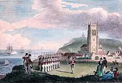 By August the divisions of the two battalions were alternately guarding prisoners of war and undergoing training.[13] While at Hilsea Barracks, Portsmouth, Windham published a drill manual, A Plan of Discipline, Composed for the Use of the Militia of the County of Norfolk, probably drawing on Townshend's knowledge, and which Townshend revised in 1768 after Windham's death.[19][20][21] This is said to have become one of the most important drill manuals employed during the American Revolution.[22] However, a report on the West Norfolks said that the officers were not well chosen, and the adjutant had been incapacitated by a stroke.[23]