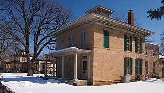 The Thorne-Lowell was built in 1861 of limestone in the Italian Villa style and featuring a cupola.[2]