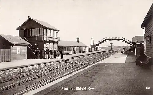 The loop line between Annfield Plain and Pelton was built by the North Eastern Railway (NER), and opened for freight trains on 1 January 1886.[1][2] This deviation line allowed several steep rope-worked inclines (on the former Pontop and South Shields Railway section of the old Stanhope and Tyne Railway) to be avoided.[3] Passenger stations on the loop line, including Shield Row, were opened on 1 February 1894.[4] The final section of the deviation between Pelton and Birtley was opened for freight trains in 1893, and for passenger trains in 1896.[5]