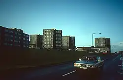 The estate was originally developed at the end of the 1960s by Lanark County Council as one of Glasgow's many new peripheral estates. Construction of the six present-day tower blocks was completed in 1970 with a total of 432 flats. The 13-storey pre-fabricated concrete towers blocks were built by Reema Scotland at a total cost of £1.25m.[4][5] The newly built estate also included a number of low-rise blocks of flats.[6][7]