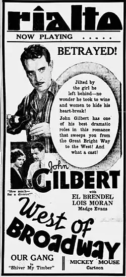 West of Broadway is a 1931 American pre-Code drama film directed by Harry Beaumont and written by Ralph Graves, Bess Meredyth, Gene Markey, and James Kevin McGuinness. The film stars John Gilbert, El Brendel, Lois Moran, Madge Evans and Ralph Bellamy. The film was released on November 28, 1931, by Metro-Goldwyn-Mayer.[1][2][3]