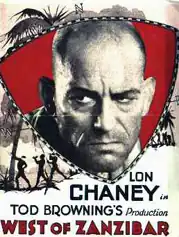 West of Zanzibar is a 1928 American silent film directed by Tod Browning. While the film has no audible dialog, it was released with a synchronized musical score with sound effects using both the sound-on-disc and sound-on-film process. The screenplay concerns a vengeful stage magician named Phroso (Lon Chaney) who becomes paralyzed in a brawl with a rival (Lionel Barrymore). The supporting cast includes Mary Nolan and Warner Baxter. The screenplay was written by Elliott J. Clawson, based on the 1926 play Kongo by Charles de Vonde and Kilbourn Gordon.[1] Walter Huston starred in the stage play and later played Phroso again in the 1932 sound film remake of the same story which was also called Kongo.
