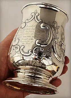 Notice was given of a Westbury Hill Sheep Fair in September in the Salisbury and Winchester Journal of 20 August 1853.[3] In September 1862 the owner of the Westbury Hill Fair gave a silver tankard (pictured) to the buyer of the largest number of sheep. On 11 September 1868 The Welshman reported that "This week several important fairs and markets have been held, and from each and all the report is a very dull trade, at barely the recently improved rates. Thus at Westbury-hill fair there was a very large supply of sheep – the largest ever known but the trade was heavy, and a clearance could not be made."[4]