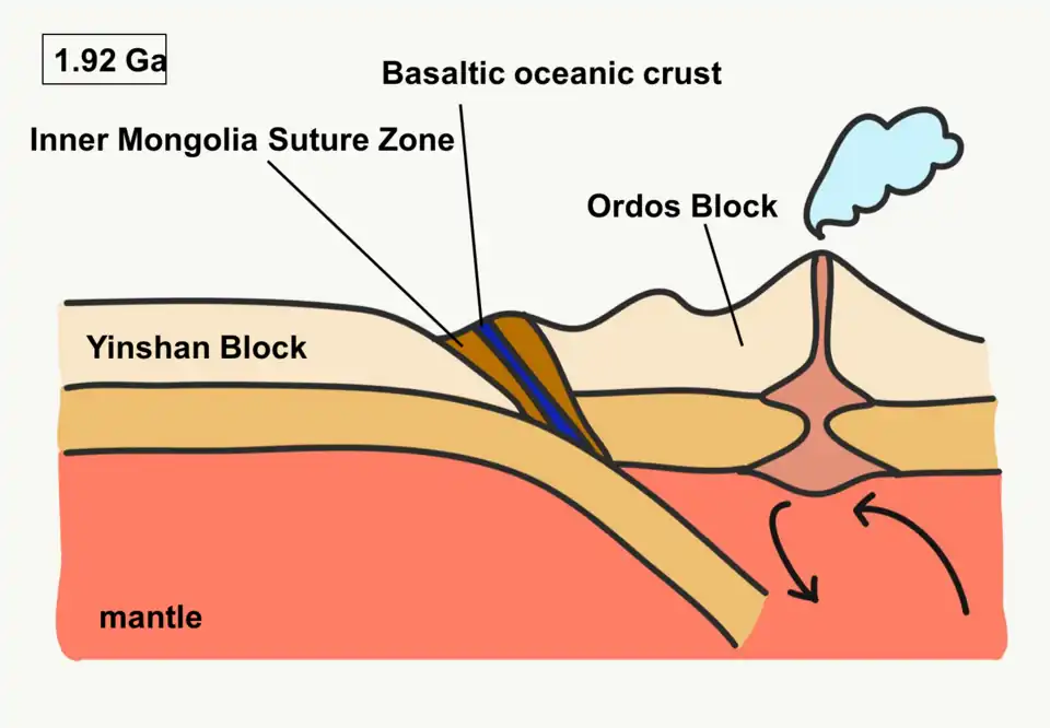 Unlike the Zhao's and Kusky's models, the tectonic evolution of the Western Block suggested by Santosh[7] primarily focused on the amalgamation of the Western Block, with fewer discussion on the early tectonic development before collisional events. Santosh considered the Ordos Block as a continental arc composed by TTGs and charnockites. Supported by zircon dating and tomographic data, Santosh proposed that the Yinshan Block and Ordos Block collided at around 1.92 billion years ago, with Yinshan Block subducted under Ordos Block. An accretionary wedge was formed when the two sub-blocks collided. Part of the basaltic oceanic crust was incorporated into the accretionary wedge. Santosh named the accretionary wedge region as Inner Mongolia Suture Zone.[7] Khondalite belt was also formed in the suture zone.[7]
