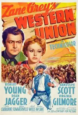 Western Union is a 1941 American western film directed by Fritz Lang and starring Robert Young, Randolph Scott, and Dean Jagger.[1] Filmed in Technicolor on location in Arizona and Utah. In Western Union, Scott plays a reformed outlaw who tries to make good by joining the team building a telegraph line across the Great Plains in 1861. Conflicts arise between the man and his former gang, as well as between the team stringing the wires and the Native Americans through whose land the new lines must run. In this regard, the film is not historically accurate; Edward Creighton was known for his honest and humane treatment of the tribes along the right of way and this was rewarded on the part of the Indians by their trust and cooperation with Creighton and his workers. The installation of telegraph wires was met with protest from no one.[2]