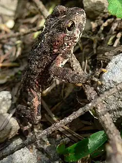 The western toad (Anaxyrus boreas) is a large toad species, between 5.6 and 13 cm (2.2 and 5.1 in) long, native to western North America.[1][3][4] A. boreas is frequently encountered during the wet season on roads, or near water at other times. It can jump a considerable distance for a toad. Breeding occurs between March and July in mountainous areas, and as early as January in lower-elevation regions. The female lays up to 17,000 eggs stuck together in strings that adhere to vegetation and other objects along water edges.[5]