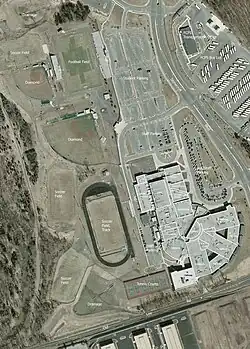 The school campus occupies 159 acres (0.64 km2) and is composed of the main building (the "school"), the sports complex including all fields, and the parking lots. The main building currently comprises two levels, with seven main hallways for the classrooms on each level. There are also 13 trailers located around the school. The hallways are listed alphabetically from A-G, and an additional hallway, "R" (for "renovation"), was added onto the school for use beginning in the 2006–07 school year.[33] The heart of the school is the library and media center which currently holds over 21,000 books with room for an additional 4,000. There are over 40 computer stations for student use in the library.