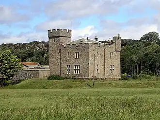 Westhall Farm, a little to the north-west of the town and approached by a lane from the Wooler road, is the site of a fortified house that was surrounded by a moat, mentioned in a 15th-century document as the Castrum de Belford.[1][2] The present house was built in 1837 in a castellated Gothic style.[3]