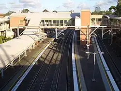 Westmead station opened in March 1883.[3] To the east of the station lies a dive through which one of the eastbound tracks passes. This was opened in 1986 as part of the quadruplication of the Main Western line between Westmead and Granville. It was necessary because west of Westmead the two westbound tracks run adjacent to one another as do the two eastbound tracks. East of Westmead, the westbound and eastbound tracks alternate.[4]
