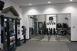 The station itself was refurbished in 1986 with a new booking office.[4] A few years later the canopy was renewed. This saw the removal of a few bays of the canopy at the east end of the station, and the replacement of the hipped canopy by a simpler modern design, although the original cast iron columns support this. Some hipped bays remain on the road side of the station entrance as a reminder of how it all once looked.