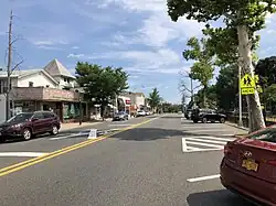 The first wave of concentrated development took place as the result of the coming of the Hackensack and New York Railroad in 1870, which followed the route of today's Pascack Valley Line. On March 5, 1870, service began between Westwood and New York City (via Jersey City and a ferry ride). Several small hotels were built near the depot, and in 1872 several houses in the latest European-influenced styles began to be built along Centre Avenue.[34] Old maps show that growth occurred simultaneously on the land both to the east and west of the tracks. The commercial buildings included lumber and coal sheds, stores, and a bakery. There was a chapel on the corner of Third and Park Avenues. The triangular park that has played an important role as a place of community gatherings is also shown on the 1876 map.[35]
