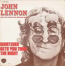 "Whatever Gets You thru the Night" is a song written by John Lennon, released as a single in 1974 on Apple Records, catalogue number Apple 1874 in the United States and Apple R5998 in the United Kingdom.[6] In the U.S. it peaked at No. 1 on all three record charts: Billboard Hot 100, Cashbox, and Record World,[7] and at No. 36 in the UK.[6][8] It was the lead single for Lennon's album Walls and Bridges; in the UK the single was released on the same day as the album. "Whatever Gets You thru the Night" was Lennon's only solo No. 1 single in the United States during his lifetime,[9] making him the last member of the Beatles to finally reach the top of the charts.[10][11][12] In Canada, the single spent two weeks at No. 2, and became the 30th biggest hit of 1974.[13]