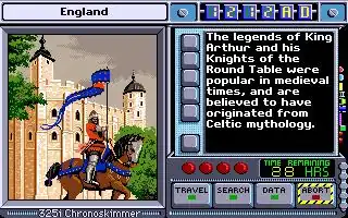 Similar to the 1985 game Where in the World Is Carmen Sandiego?, the player plays as a secret agent for the Acme Detective Agency, and has to use research books to crack the clues given to them on where the crook went to, and also decode the physical attributes or interests of the crook based on other clues. They must achieve both these objectives in order to secure an arrest warrant, which allows them to identify the person at the end of the case as the crook. The player travels through time and space with a device known within the Carmen Sandiego universe as the Chronoskimmer. The game is time limited, and every action one takes uses up some of that time; the player needs to solve the case within the allotted time in order to be successful. As well as teaching the player about both geography and history it also provides practice with using a research book – the New American Desk Encyclopedia comes with the game for assistance.[1] The people, events, and inventions featured in the game hail from period in history ranging from 400 AD to the 1950s – the past 1500 years of human history.[2] The game also comes with a 28-page instruction manual.[3]