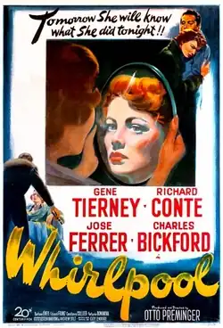 Whirlpool is a 1950[1][2] American film noir thriller directed by Otto Preminger and written by Ben Hecht and Andrew Solt, adapted from the 1946 novel Methinks the Lady... by Guy Endore. The film stars Gene Tierney, Richard Conte, José Ferrer and Charles Bickford, and features Constance Collier in her final film role. Its plot follows the kleptomaniac wife of a wealthy Los Angeles psychoanalyst who, after a chance meeting with a hypnotist, is charged with a violent murder.