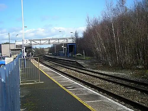 The station has two platforms and a footbridge. There used to be a large signal box here, which was latterly switched out of use, although operational if required; this was closed and demolished in 2012[4] whilst the one-time goods shed has been turned into a garage. The former up loop and down bay platforms have both had their track removed (the former is fenced off) and the main buildings (booking hall, waiting room and offices) have also been demolished.[3]