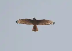 This slim and small hawk is easily identified by its white iris and the white throat and dark mesial stripe. A white spot is sometimes visible on the back of the head. When perched, the wing tip nearly reaches the tip of the tail. The ceres are distinctly yellow and the head is dark with the underside of the body darkly barred. In flight, the narrow wings appear rounded with black tips to the feathers and the wing lining appears dark. The upper wing in flight shows a pale bar over the brown. The rufous tail is barred with a darker subterminal band. Young birds have the iris brownish and the forehead is whitish and a broad supercilium may be present.[2] The only confusion can occur in places where it overlaps with the grey-faced buzzard (Butastur indicus), adults of which have a distinctive white supercilium.[3][4] Fledgelings are reddish brown, unlike most other downy raptor chicks, which tend to be white.[5]