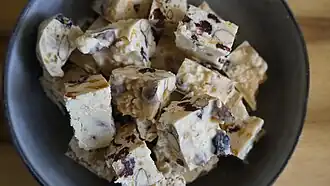 White Christmas is an Australian dessert[1] made from dried fruit such as sultanas, glacé cherries, desiccated coconut, icing sugar, milk powder and Rice Bubbles, with hydrogenated coconut oil (such as the brand Copha) as the binding ingredient.[2]