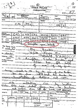 The radio log is headed, "Daughter gone berserk": "Mr Bamber, White House Farm, Tolleshunt d’Arcy—daughter Sheila Bamber, aged 26 years, has got hold of one of my guns." It adds: "Message passed to CD by the son of Mr Bamber after phone went dead." It goes on to say: "Mr Bamber has a collection of shotguns and .410s", and it includes White House Farm's telephone number. The final entry says: "0356 GPO [the telephone operator] have checked phone line to farmhouse and confirm phone left off hook." The radio log shows that a patrol car, Charlie Alpha 7 (CA7)—not Charlie Alpha 5, as mentioned in the event log—was sent to the scene at 3:35 am.[93]