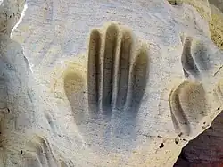 Hundreds of carved figures dot the sandstone cliffs at the White Mountain Petroglyph site in Wyoming’s Red Desert. Etched into the stone surface some 200 to 1,000 years ago, several figures appear to portray bison and elk hunts while others depict geometric forms or tiny footprints. Handprints are worn into the rock as well, providing visitors with a compelling connection to those who used the site long ago.[11]