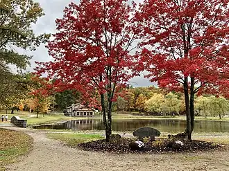 White Park is a 25-acre (10 ha) public park on the west side of central Concord, New Hampshire. It occupies a roughly polygonal parcel of land surrounded by predominantly residential streets, with the University of New Hampshire School of Law located across White Street from the park's eastern corner. Its west side is characterized by a steep, rocky rise of about 40 feet (12 m) above an otherwise relatively flat landscape. The park's major features include a large man-made pond, and there are active recreational facilities, including basketball and handball courts, and a baseball diamond. The traditional main gate is located at the junction of Washington and Centre streets, with a wall section that includes a built-in structure originally used as a covered shelter for a streetcar stop.[2] The pond is transformed into an outdoor skating rink in winter. The park is also home to the city's largest playground, called the Monkey Around Playground.