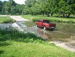 Among the park's most distinctive and well-known features are the vehicular river crossings. At three places, crossing Pine Creek, fords were constructed instead of bridges.[5] The fords offer visitors a chance to actually drive through the creek, though high water frequently closes the crossings.[5][9] Hikers are relegated to pedestrian bridges or stepping stones in the creek to cross the stream.[10] Floods are frequent enough on Pine Creek, a large watershed to the north of the park, that there is an emergency exit from the campground. When high water closes the fords, the campground is cut off and the emergency exit is the only way out.[5]