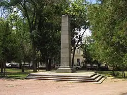 Since 1920, the central square in Tsaritsyn has been called the "Square of Fallen Fighters", where the remains of 55 victims of the White Terror are buried. A monument established in 1957 in black and red granite has an inscription: "To the freedom fighters of Red Tsaritsyn. Buried here are the heroic defenders of Red Tsaritsyn brutally tortured by White Guard butchers in 1919."[42]