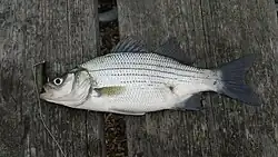 The white bass, silver bass, or sand bass (Morone chrysops) is a freshwater fish of the temperate bass family Moronidae. commonly around 12–15 inches long. The species' main color is silver-white to pale green. Its back is dark, with white sides and belly, and with narrow dark stripes running lengthwise on its sides. It has large, rough scales and two dorsal fins. They are widely distributed across North America, inhabiting large reservoirs and rivers. When mating in the spring, they are more often found in shallow rivers, creeks, and streams. They have been introduced in some places as sport fish and also to predate on nuisance fish, such as gizzard shad. It is the state fish of Oklahoma.
