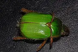 Males' front legs are usually green or light brown to match their body color. While females' front legs are mostly light brown, their back legs are green like their bodies. Male beetles have all green legs with a shiny appearance, especially on the middle and back legs, while females have green legs with varying degrees of shine. The ends of their front leg teeth are always black.[3]