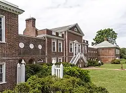 A second floor was added by John Ridout in 1793, with bedrooms directly above the drawing rooms in the main pavilion, with a gabled roof whose ridge coincided with the portico roof. The second story was removed during the comprehensive restoration that began in the 1950s under Charles Scarlett, Jr.[3]